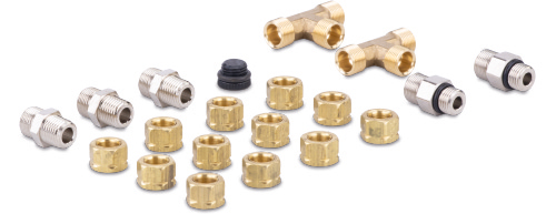 Anschlusskit für einen zweiten Steuerstand im SeaStar Hydrauliklenksystem. Das HF5502 Fitting Kit ermöglicht den Anschluss von 3/8" Nylonleitungen an 1/4" NPT-Gewinde. Korrosionsbeständiges Messing und präzise Klemmringverschraubungen sorgen für eine sichere, druckfeste Verbindung im Hydraulikkreislauf.