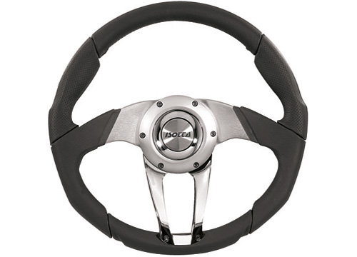 Hochwertiger Komfort-Steuerrad-Zulag von Isotta mit sportivem Design und ergonomischer Form. Gefertigt aus poliertem Chromstahl und edlem Genuine/Vinyl-Leder. Flanschring und zwei Speichen aus anodisiertem Aluminium, Doppelsteg-Speiche und Flanschkappe aus SS316 Edelstahl.