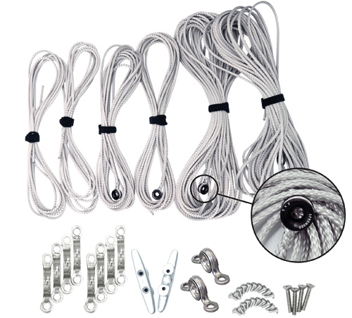 Lazy Jack System für Segelboote bis 30 Fuß zur sicheren und kontrollierten Bergung des Großsegels. Das Segel fällt sauber in die durch Taue gebildete Tasche. Komplettset mit Tauwerk, Rundkauschen, Fenderösen, Belegklampen, Schrauben und Tef-Gel für einfache Montage an Bord.