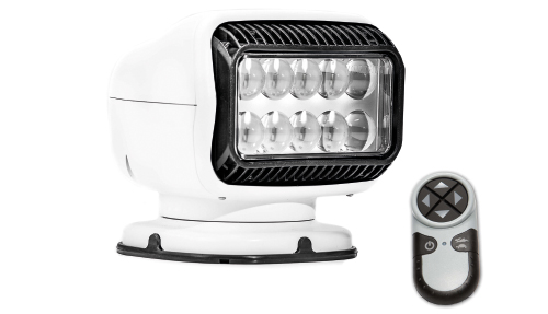 Funkferngesteuerter LED Suchscheinwerfer von Golight mit 370° horizontaler und 135° vertikaler Drehbarkeit für maximale Ausleuchtung auf dem Wasser. UV- und korrosionsbeständiges, weißes Gehäuse, 12 V Anschluss und 30 m Funkreichweite – ideal für sichere Navigation bei Nacht.