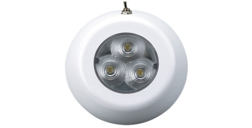 Kompakte LED Innenleuchte Ø 90 mm als preiswerte Aufbauleuchte für Kajüte, Kabine oder Wohnbereich an Bord. Mit integrierter Schalterfunktion, nur 25,7 mm Aufbauhöhe und moderner LED-Technik für sparsamen Stromverbrauch und angenehmes Licht.