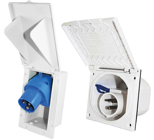 CEE Einbaustecker im robusten Kunststoffgehäuse für die sichere Stromversorgung im maritimen Bereich. Mit praktischem Klappdeckel zum Schutz vor Feuchtigkeit und Spritzwasser. Ideal für Bordstrom-Installationen im Hafen oder an Landanschlüssen.