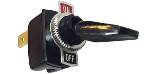 Kompakter Ein/Aus Kippschalter mit schwarzem Hebel und Chrom-Schraubring für die Montage auf Blechpaneelen. Mit praktischer Steckverbindung und entfernbarer ON/OFF Beschriftung. Ideal für 12V und 24V Bordelektrik im Bereich Nautik und Wassersport.