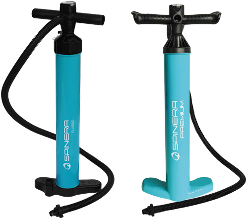 Leistungsstarke Doppelhub-Handpumpe von Spinera für schnelles und effizientes Aufpumpen von SUP Boards und aufblasbaren Kajaks. Mit Manometer für präzise Druckkontrolle in Bar und PSI, robustem Aluminiumschaft, großem Pumpkörper und H3-Bajonettadapter für hohe Luftleistung.
