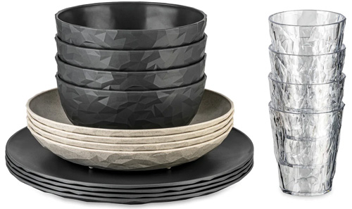 Bruchfestes 16-teiliges Bordgeschirr-Set CLUB Göteborg für Yacht, Camping und Outdoor. Stapelbar, spülmaschinen- und mikrowellengeeignet (600 W). Gefertigt aus hochwertigem, melaminfreiem Organic Bio-Circular-Material, 100 % recyclebar – ideal für Törn, Caravan und Freizeit.