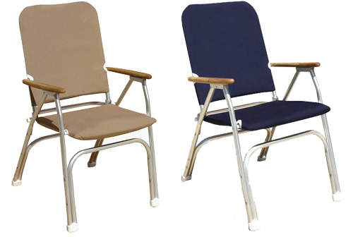 Komfortabler Klappstuhl „Dinner D“ von Forma mit 5 cm starker Polsterung und hoher Rückenlehne für entspanntes Sitzen an Deck, im Cockpit oder beim Camping. Robustes 25 mm Aluminiumgestell mit Teak-Armlehnen, rutschfesten Fußkappen und abnehmbarer, waschbarer Bespannung.