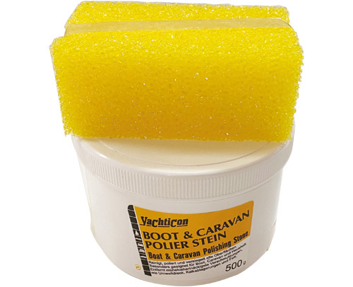 Universal-Polierstein für Boot, Caravan & Haushalt. Reinigt, poliert und versiegelt alle Oberflächen mühelos. Entfernt hartnäckigen Schmutz, Kalk und Umweltablagerungen. Biologisch abbaubar und inkl. praktischem Schwamm – ideal für Törn, Camping & Alltag.