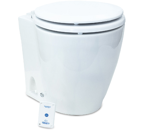 Moderne Elektro-Bordtoilette mit integriertem 12 V Zerhacker und Pumpe für Spülung und Entsorgung in einem Arbeitsgang. Robuste Basis für sichere Installation an Bord. Pflegeleichte Keramikschale mit weißem Holzsitz inklusive elektrischer Schalttafel.