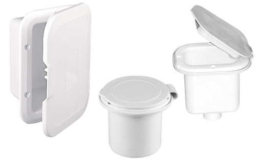 Praktische Duschkopf-Box aus robustem, weißem Kunststoff mit passendem Deckel. Ideal für den geschützten Einbau im Sanitärbereich an Bord. Erhältlich in senkrechter, waagrechter oder runder Ausführung – funktional, platzsparend und langlebig für den maritimen Einsatz.