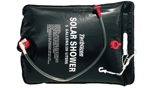 Praktische Solardusche für Segelboot, Motorboot und Camping. Der schwarze PVC-Sack erwärmt das Wasser durch Sonneneinstrahlung ganz ohne Strom. Mit integriertem Duschschlauch und Aufhängevorrichtung – ideal für erfrischende Duschen an Bord, im Hafen oder unterwegs.