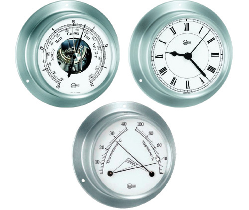 Die Instrumente der Serie Sky von Barigo überzeugen mit einem eleganten Edelstahlgehäuse und hochwertig polierter Oberfläche. Wahlweise als Uhr, Barometer oder Comfortinstrument mit Thermometer und Hygrometer erhältlich – präzise Messtechnik für den Einsatz an Bord.