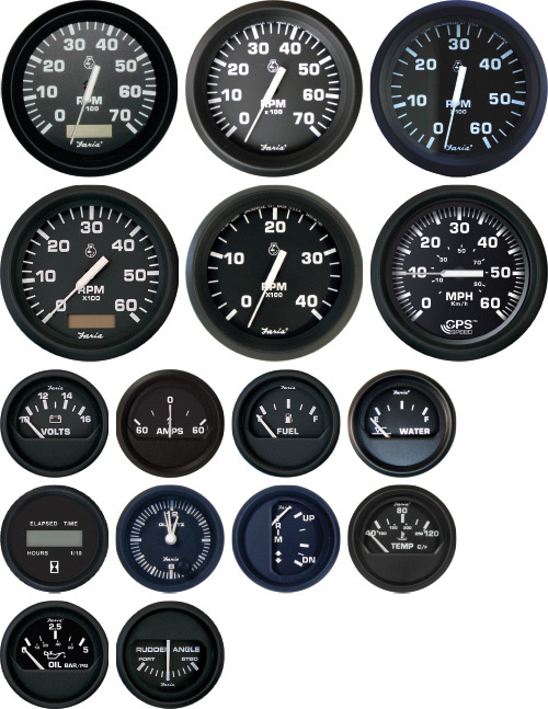 Euro Black Instrumentenserie mit schwarzem Zifferblatt und gut ablesbaren weißen Ziffern. 12-Volt-Marineinstrumente für Drehzahl, Geschwindigkeit, Spannung, Temperatur, Druck und Füllstand. Robustes Design mit schwarzem Rand – ideal für Steuerstände im Segel- und Motorboot.
