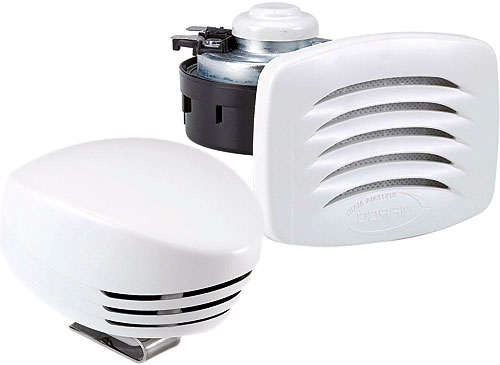 Elektromagnetisches Bootshorn für kleine Boote mit hoher Lautstärke von 108 dB. Robuste ASA-Hülle, Edelstahl-Haltebügel (AISI 304) und effizientes Drainagesystem. Kompaktes Design, einfache Montage als Einbau- oder Anbauversion, 12 V Betrieb.